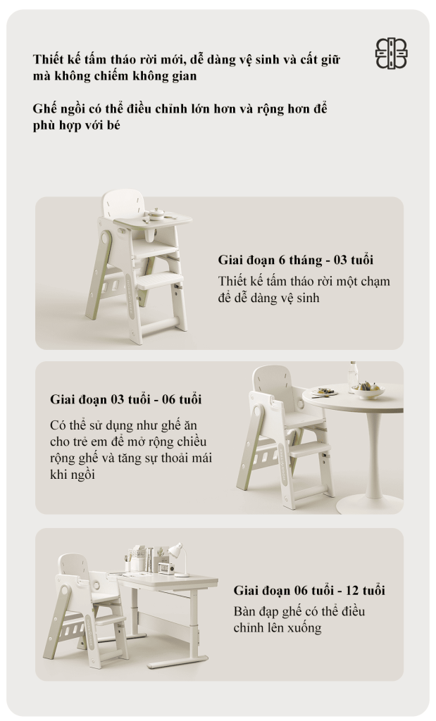 => 3 tuổi – 6 tuổi: Có thể tháo mặt bàn làm ghế ăn cùng gia đình.
