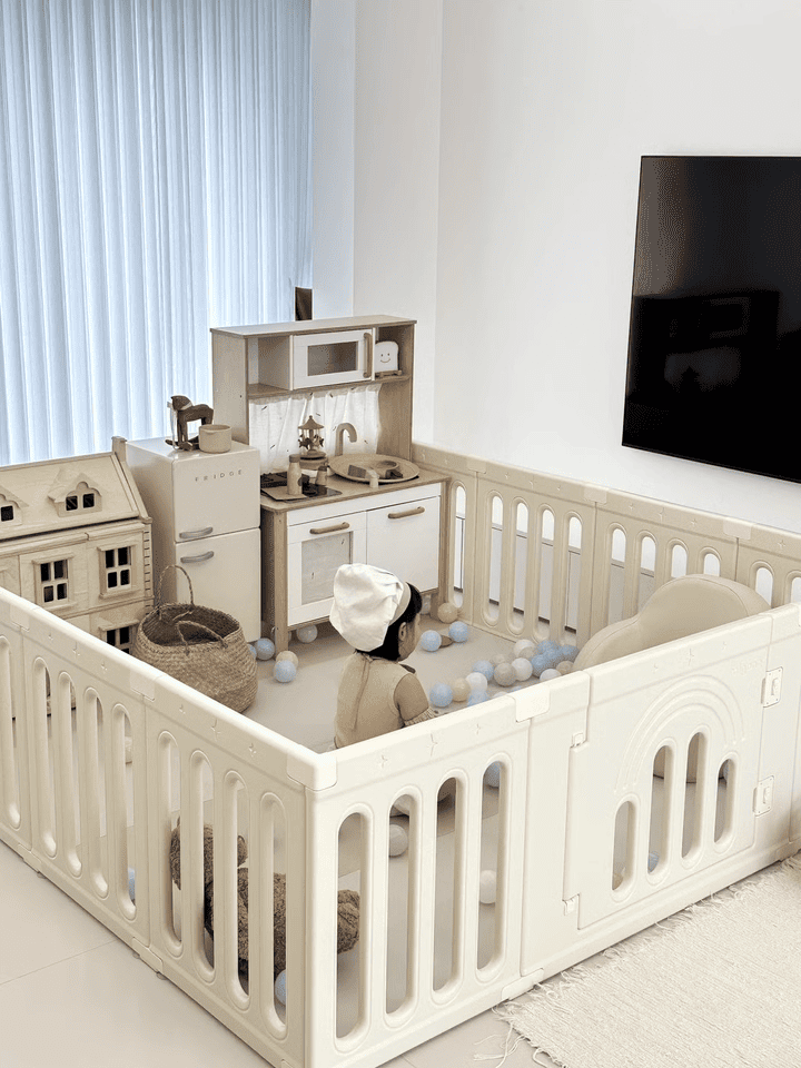 + Quây được thiết kế với màu trắng để giúp ba mẹ dễ dàng decor, trang trí phòng bé. Đặc biết với phiên bản nâng cấp có thêm thiết kế hình ngôi nhà xinh xắn, giúp tạo nên khu vui chơi cho bé cực kỳ thú vị.