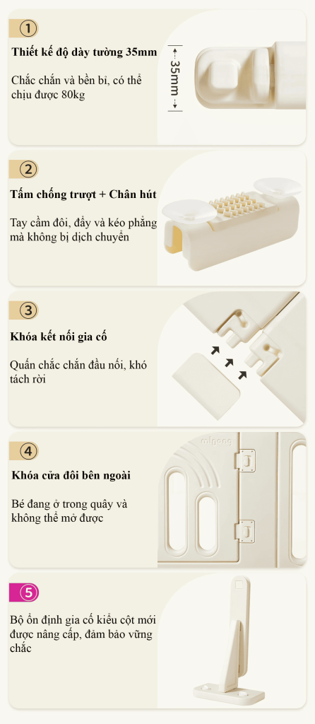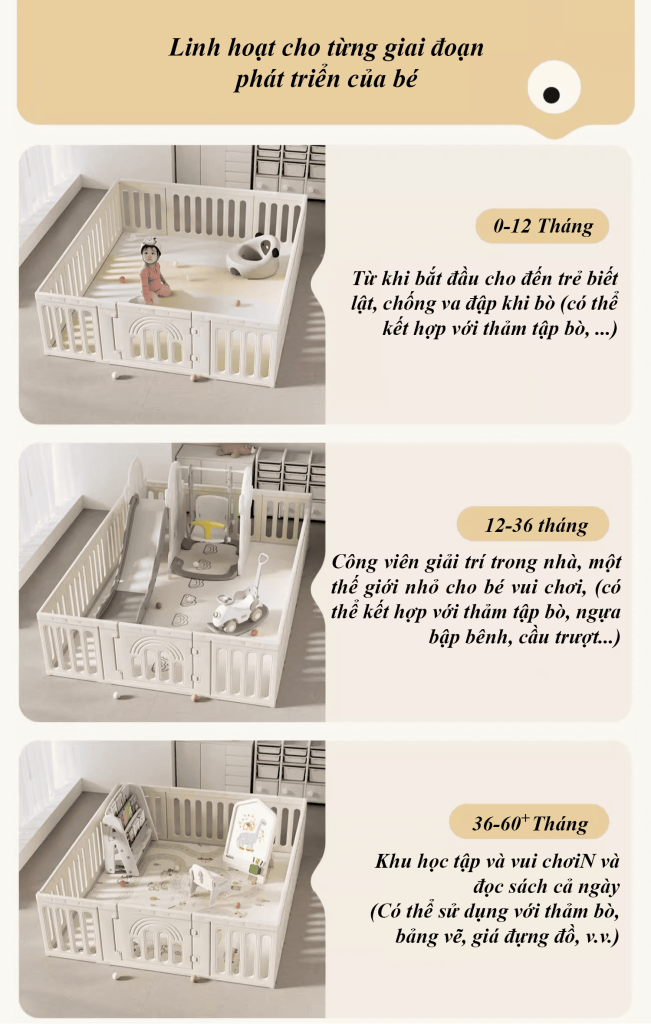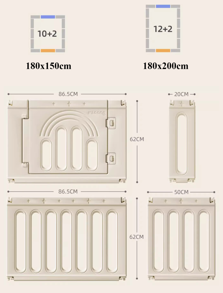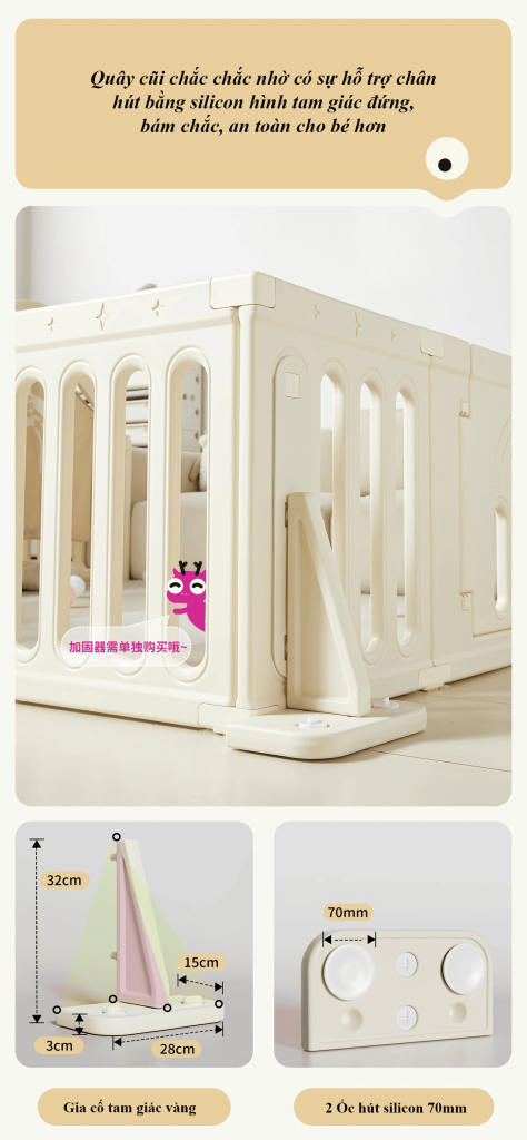 + Thành quây cao 62cm, thanh rộng 50cm, gia cố bằng các khớp nối và khóa thông minh vô cùng kiên cố.