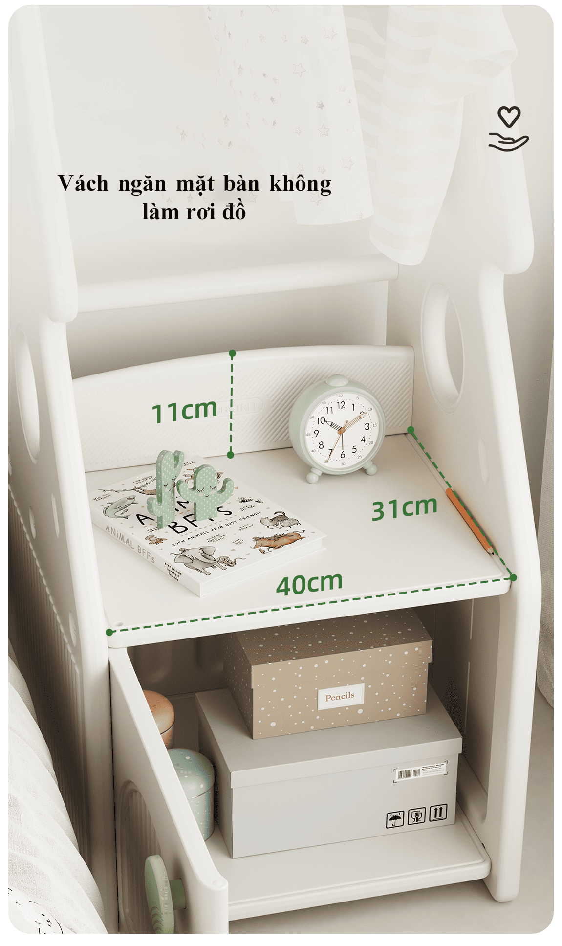 – Tủ đựng đồ: Hộc tủ dung tích lớn, có thể đựng được các đồ vật kích thước lớn mà ngăn kéo thông thường không đựng được. Bề mặt tủ rộng có vách phía sau (11cm), hạn chế rơi đồ vật.