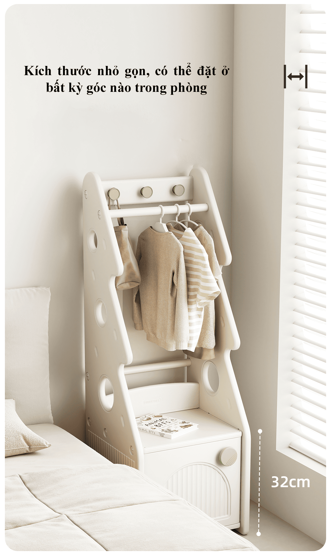 – Phía trên thanh treo có thêm móc tròn cố định, giữ cho móc áo không bị trượt – đảm bảo mọi thứ luôn ngăn nắp.