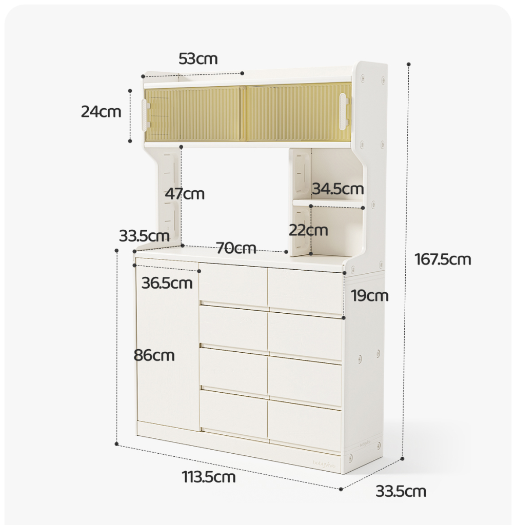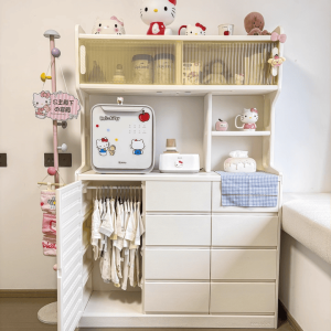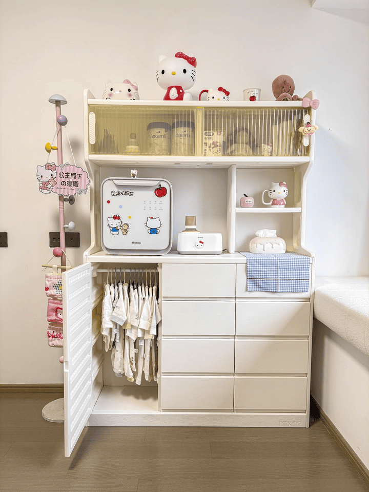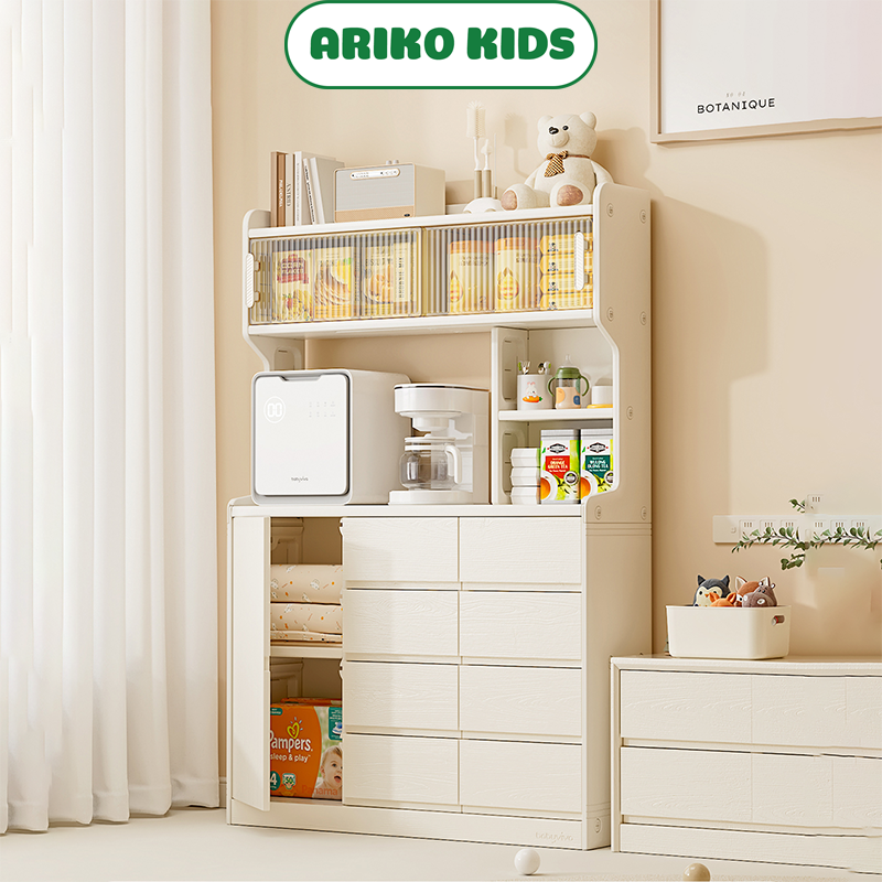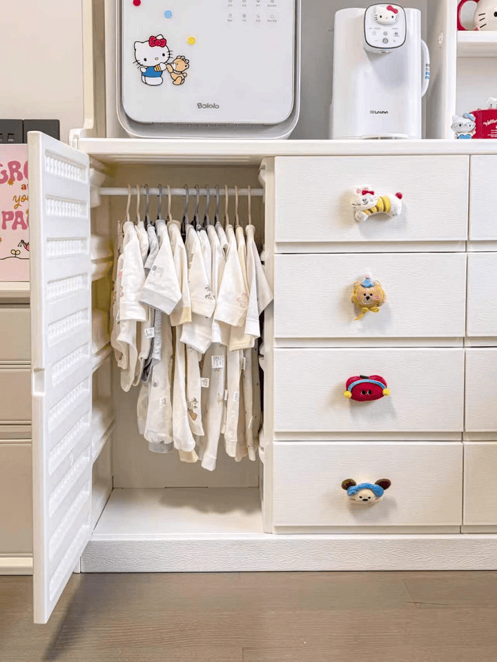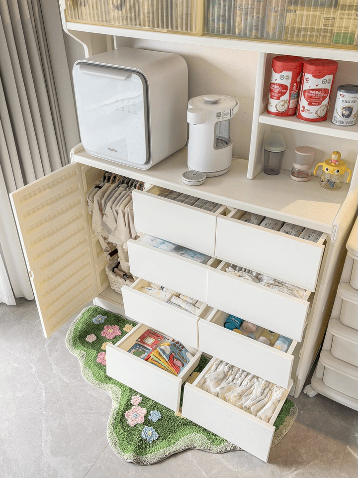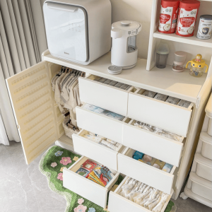 – Tủ được chia thành nhiều ngăn kéo và hộc tủ với dung tích lớn, có thể tăng thêm 30% không gian lưu trữ mà vẫn giữ nguyên diện tích sàn, giúp mẹ dễ dàng phân loại đồ dùng của bé như quần áo, bình sữa, khăn tắm và các phụ kiện khác.